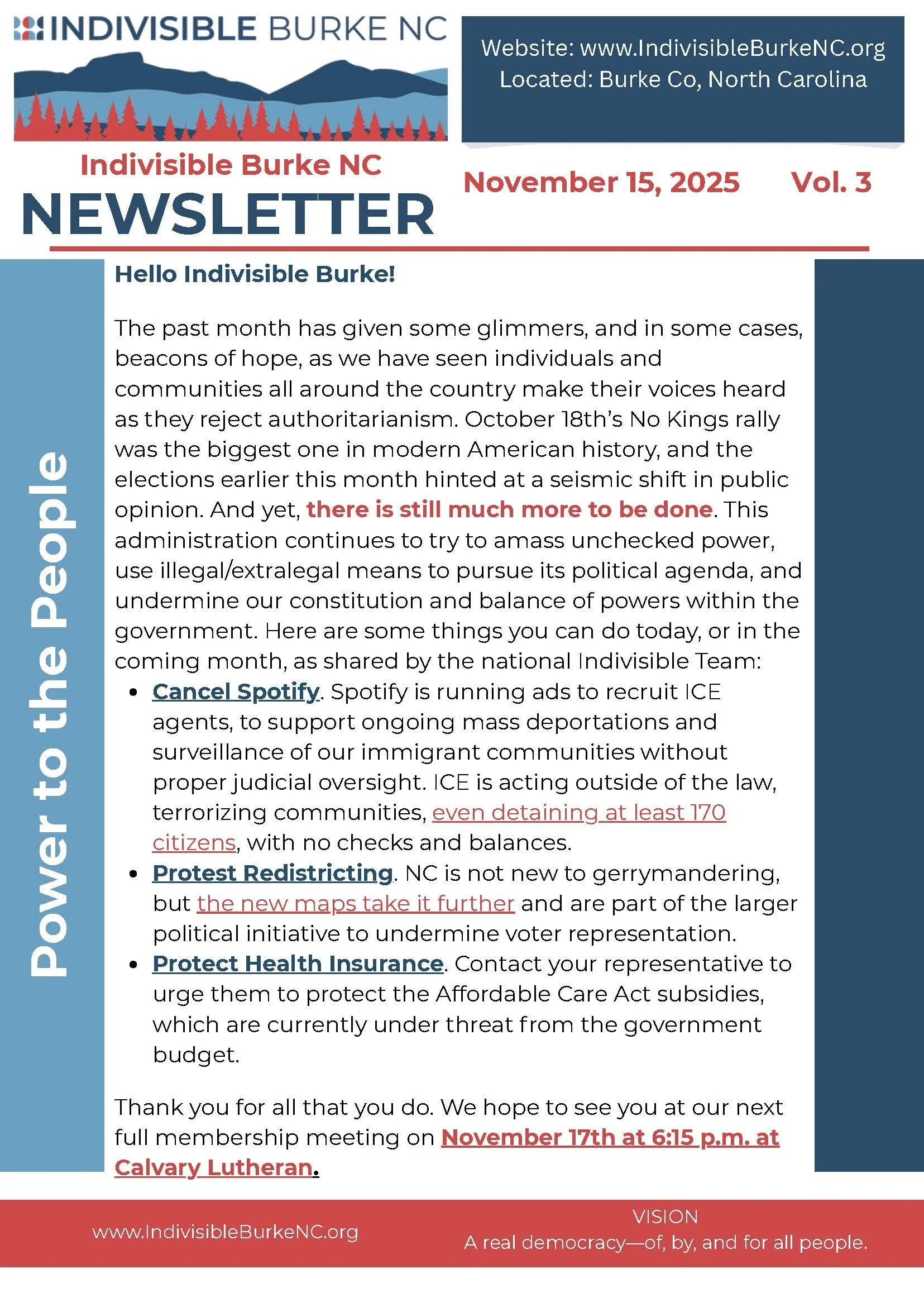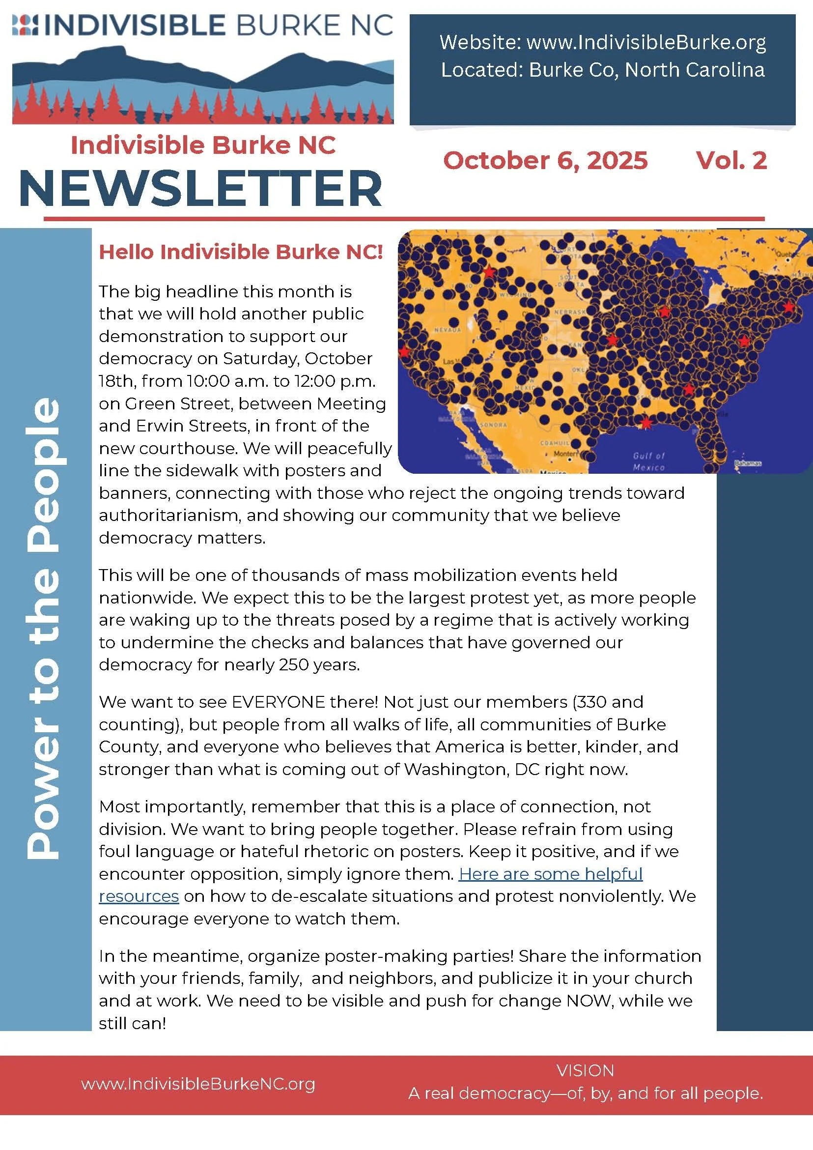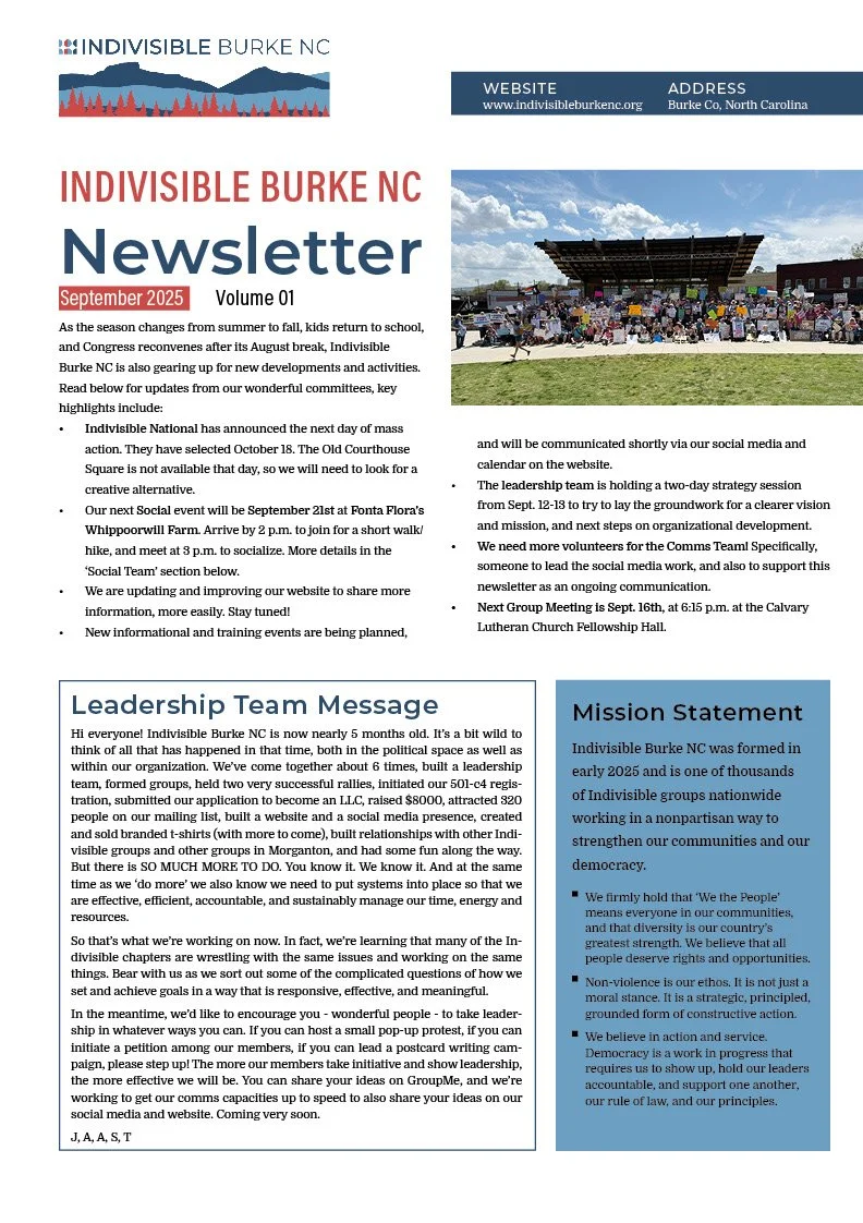 Welcome to Indivisible Burke NC! Our newsletter is your go-to resource for updates on local events, community actions, and ways to make your voice heard here in Burke County.